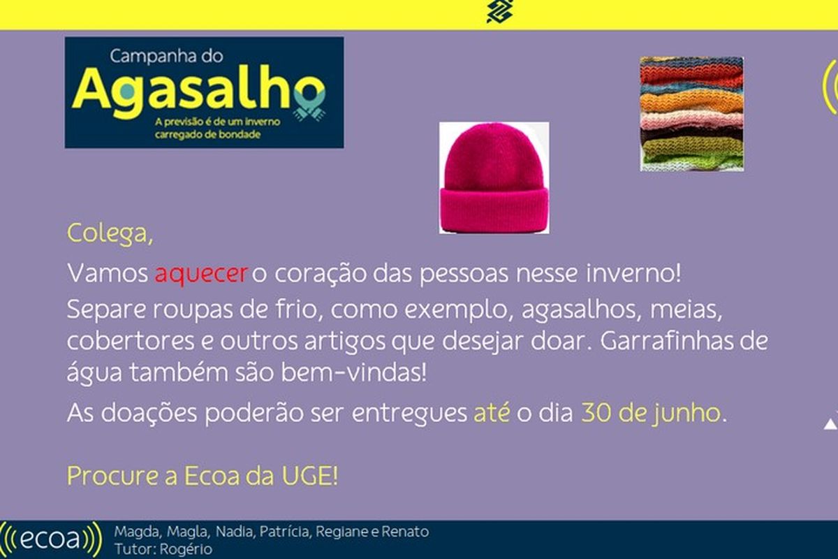 A Ecoa UGE divulgou em 17/05/2023 comunicação interna sobre a campanha do agasalho e disponibilizou caixa para a arrecadação de roupas de frio (agasalhos, meias, cobertores etc.) e garrafinhas de água, com prazo até 30/06/2023. Após o término, integrantes da Ecoa irão à instituição escolhida para efetuar a entrega.