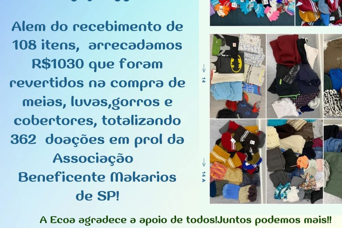 Campanha de inverno para recebimento de doações de gorros, luvas, meias, cachecóis, cobertores, blusas e calças. além de leite em pó e chocolate em pó em prol da ONG Makarios de SP.